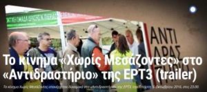Σήμερα, Τετάρτη 5 Οκτωβρίου, στις 11 το βράδυ, στην ΕΡΤ3 θα προβληθεί στην εκπομπή «Αντιδραστήριο», ντοκιμαντέρ με θέμα τις αγορές «Χωρίς Μεσάζοντες» και τις θέσεις του κινήματος. Η εκπομπή καταγράφει τις απευθείας διαθέσεις προϊόντων σε Κατερίνη και Βόλο, με τις οποίες άρχισαν οι δράσεις του κινήματος προς αυτή την κατεύθυνση. Μεταδίδεται: Τετάρτη, 5 Οκτωβρίου 2016, …