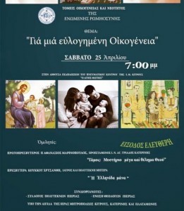 Η «Ενωμένη Ρωμηοσύνη» σε συνδιοργάνωση με τον Σύλλογο Πολυτέκνων Πιερίας και την Ένωση Θεολόγων Περίας, σας καλούν να παραβρεθείτε στην εκδήλωση «Για μια ευλογημένη Οικογένεια», στην αίθουσα εκδηλώσεων του Πνευματικού Κέντρου «Ο Άγιος Φώτιος», το Σάββατο 25 Απριλίου, στις 7μ.μ. Ομιλητές:π. Αθανάσιος Μαρινόπουλος, πρεσβυτέρα Κούκκου Χρυσάνθη. Η εκδήλωση τελεί υπό την αιγίδα της Ιεράς Μητροπόλεως …