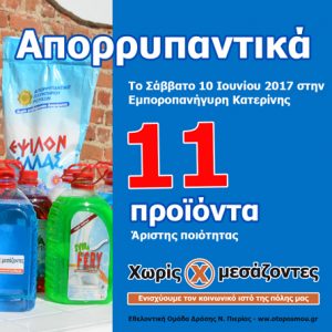 Σάββατο 10 Ιουνίου 2017, από τις 8:30 έως 10:30 στο χώρο της Εμποροπανήγυρης Κατερίνης. Απορρυπαντικά / Χαρτικά: Πρόκειται για προϊόντα ελληνικής παραγωγής (Epsilon Hellas, Αλώνια Πιερίας), άριστης ποιότητας και μπορούν να συγκριθούν με τα καλύτερα της αγοράς. Η διαφορά τους με τα επώνυμα προϊόντα των Super Merkets είναι, πως η προμήθειά τους από το κίνημα …