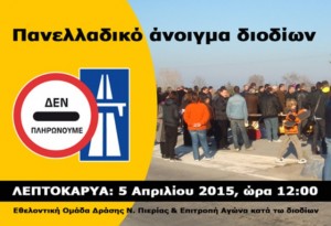 Κυριακή 5 Απριλίου: Παμπιερική Επιτροπή Αγώνα. Διαμαρτυρία στον σταθμό διοδίων της Λεπτοκαρυάς.