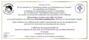 Με την ευκαιρία του εορτασμού της «Παγκόσμιας Ημέρας για τα δικαιώματα των Γυναικών» που γιορτάζεται στις 8 Μαρτίου, η «ΠΑΝΑΘΗΝΑΪΚΗ» Πανελλαδική Οργάνωση Γυναικών-Παράρτημα διοργανώνει εκδήλωση την Κυριακή 19 Μαρτίου και ώρα 11.30 στο Πνευματικό Κέντρο του Δήμου Κατερίνης με τίτλο «Πρωτοπόρες γυναίκες στο στίβο της ζωής». Κεντρική ομιλήτρια στην εκδήλωση θα είναι η πρύτανης του …