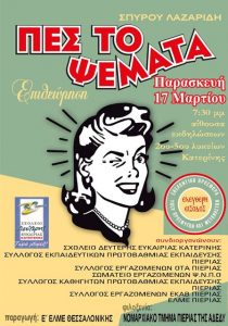 Οι παπούδες μας πρόσφυγες Οι γονείς μας μετανάστες Εμείς ρατσιστές; Το Νομαρχιακό Τμήμα Πιερίας της ΑΔΕΔΥ υποστηρίζοντας δράσεις ανθρωπιάς και αλληλεγγύης διοργανώνει πολιτιστική εκδήλωση σε συνεργασία με το θεατρικό τμήμα της Ε’ ΕΛΜΕ Θεσσαλονίκης. Πρόκειται για τη θεατρική παράσταση-επιθεώρηση με κείμενα και τραγούδια «Πες το ψέματα» , που είναι αφιερωμένη στούς πρόσφυγες και τους …