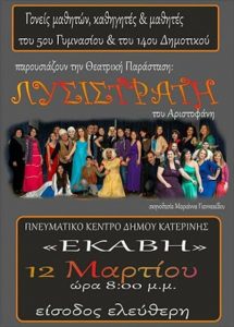 Γονείς μαθητών, καθηγητές και μαθητές του 5ου Γυμνασίου και του 14ου Δημοτικού Σχολείου Κατερίνης παρουσιάζουν την θεατρική παράσταση Λυσιστράτη, του Αριστοφάνη, σε σκηνοθεσία Μαριάννας Γιαννακίδου. Στο Πνευματικό Κέντρο του Δήμου Κατερίνης ΕΚΑΒΗ την Κυριακή 12 Μαρτίου και ώρα 20:00. Η ΕΙΣΟΔΟΣ ΕΙΝΑΙ ΕΛΕΥΘΕΡΗ Η Λυσιστράτη είναι κωμωδία του Αριστοφάνη που γράφτηκε και διδάχθηκε το 411 …