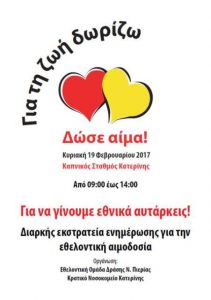Σάββατο 18 Φεβρουαρίου 2017, από τις 10:30 έως τις 13:30 θα βρεθούμε στον πεζόδρομο, στο ύψος της κεντρικής Πλατείας, όπου θα διανέμουμε διαφημιστικό υλικό για την εθελοντική αιμοδοσία της Κυριακής, στον Καπνικό Σταθμό. Έχουν τυπωθεί 30 μπλουζάκια με το λογότυπο της δράσης και θα μοιραστούν στα μέλη της ομάδας που θα έρθουν στην Πλατεία για …