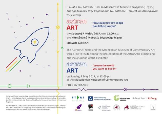 To«AstronART-Δημιούργησε τον κόσμο που θέλεις να ζεις» είναι ένα project της Φανής Μπουντούρογλου, υπότροφου του προγράμματος START– Create Cultural Change (2016-2017) του Ιδρύματος Robert Bosch σε συνεργασία με το Ινστιτούτο Goethe Θεσσαλονίκης και την Ομοσπονδιακή Ένωση Κοινωνικοπολιτιστικών Κέντρων της Γερμανίας.