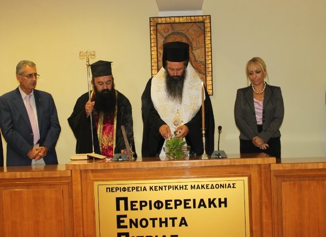 Ενόψει της νέας Περιφερειακής θητείας, η Αντιπεριφερειάρχης Πιερίας, κ. Σοφία Μαυρίδου, προσκάλεσε τους εργαζομένους της Περιφερειακής Ενότητας Πιερίας, σε τελετή Αγιασμού που τέλεσε ο Μητροπολίτης Κίτρους, Kατερίνης και Πλαταμώνος κ.κ. Γεώργιος, ανήμερα της ονομαστικής της εορτής, 17 Σεπτεμβρίου 2014, στην αίθουσα συνεδριάσεων της Περιφερειακής Ενότητας Πιερίας.