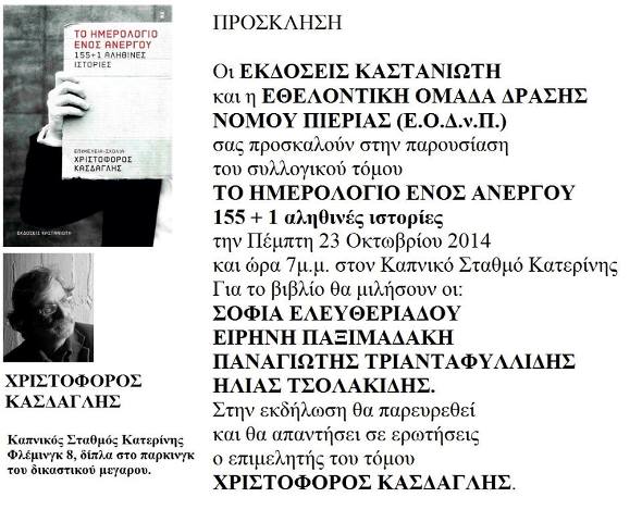 Οι ΕΚΔΟΣΕΙΣ ΚΑΣΤΑΝΙΩΤΗ και η ΕΘΕΛΟΝΤΙΚΗ ΟΜΑΔΑ ΔΡΑΣΗΣ Ν.ΠΙΕΡΙΑΣ (ΕΟΔνΠ) σας προσκαλούν στην παρουσίαση του συλλογικού τόμου ΤΟ ΗΜΕΡΟΛΟΓΙΟ ΕΝΟΣ ΑΝΕΡΓΟΥ 155 + 1 αληθινές ιστορίες, την Πέμπτη 23 Οκτωβρίου 2014 και ώρα 7μ.μ. στον Καπνικό Σταθμό Κατερίνης, δίπλα στο παρκινγκ του δικαστικού μεγαρου.
