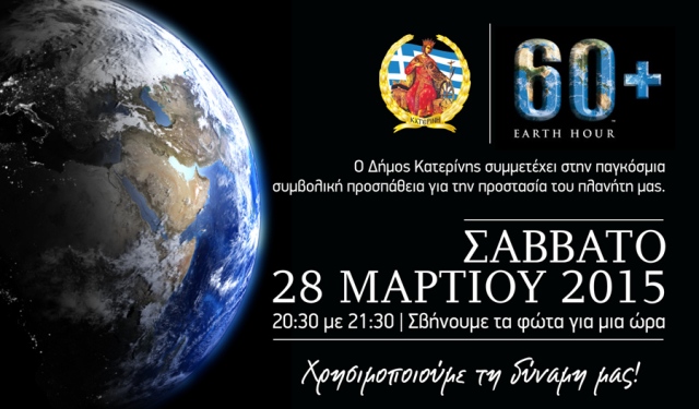 Ο Δήμος Κατερίνης, στηρίζοντας την παγκόσμια προσπάθεια ευαισθητοποίησης σε περιβαλλοντικά θέματα, συμμετέχει στην παγκόσμια εκστρατεία η «Ώρα της Γης», μια δράση της WWF. Το Σάββατο 28 Μαρτίου 2015, από τις 20:30 εως τις 21:30, σβήνουμε συμβολικά τα φώτα στα εξής σημεία: