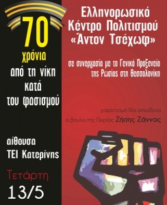 Το Ελληνορωσικό Κέντρο Πολιτισμού «Άντον Τσέχωφ» διοργανώνει εκδήλωση με αφορμή τα 70 χρόνια από τη νίκη κατά του φασισμού σε συνεργασία με το Γενικό Προξενείο της Ρωσίας στη Θεσσαλονίκη.