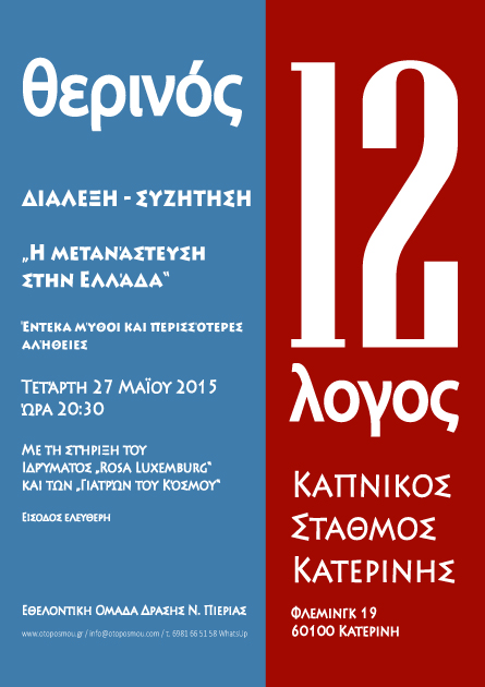 Διαλέξαμε, λοιπόν, έντεκα από τους πιο διαδεδομένους μύθους σχετικά με τη μετανάστευση στην Ελλάδα και σας καλούμε σήμερα, Τετάρτη 27 Μαΐου 2015, ώρα 20:30, στην φιλόξενη αυλή του Καπνικού Σταθμού Κατερίνης, να τους συζητήσουμε.