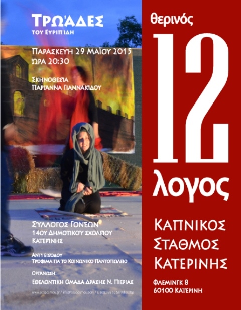 Σήμερα, Παρασκευή 29 Μαΐου 2015, ώρα 20:30, πρεμιέρα θεατρικών παραστάσεων στην φιλόξενη αυλή του Καπνικού Σταθμού Κατερίνης, με τις «Τρωάδες» του Ευριπίδη, σε σκηνοθεσία Μαριάννας Γιαννακίδου.