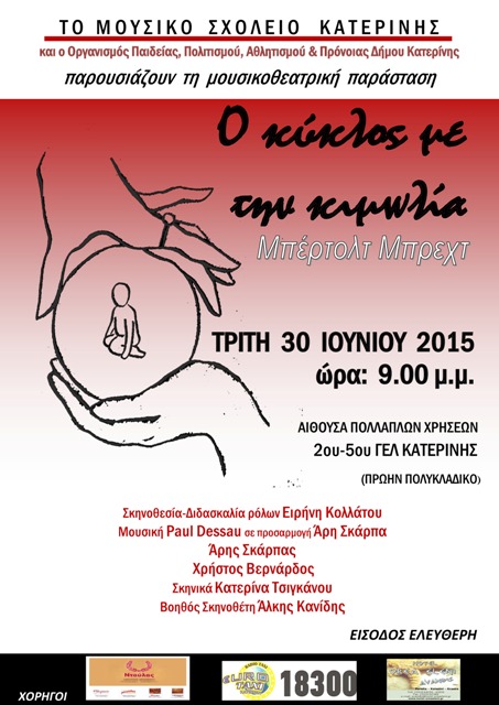 – Τη μουσικοθεατρική παράσταση «Ο κύκλος με την κιμωλία», ένα γοητευτικό, λαϊκό παραμύθι, του Μπέρτολτ Μπρεχτ παρουσιάζουν το Μουσικό Σχολείο Κατερίνης και ο Οργανισμός Παιδείας Πολιτισμού Αθλητισμού και Πρόνοιας του Δήμου Κατερίνης, αύριο Τρίτη 30 Ιουνίου και ώρα 21:00 στην αίθουσα πολλαπλών χρήσεων 2ου – 5ου ΓΕΛ (πρώην Πολυκλαδικό Λύκειο).