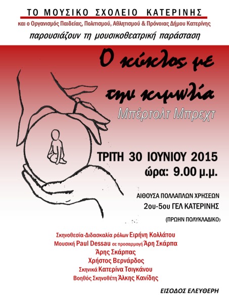 Τη μουσικοθεατρική παράσταση «Ο κύκλος με την κιμωλία», ένα γοητευτικό, λαϊκό παραμύθι, του Μπέρτολτ Μπρεχτ παρουσιάζουν το Μουσικό Σχολείο Κατερίνης και ο Οργανισμός Παιδείας Πολιτισμού Αθλητισμού και Πρόνοιας του Δήμου Κατερίνης, αύριο Τρίτη 30 Ιουνίου και ώρα 21:00 στην αίθουσα πολλαπλών χρήσεων 2ου – 5ου ΓΕΛ (πρώην Πολυκλαδικό Λύκειο).