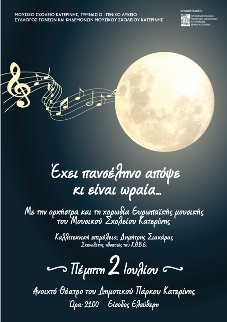 Μουσικό αφιέρωμα στην Πανσέληνο, στο ολόγιομο φεγγάρι, σύμβολο της ζωής, της ομορφιάς, του έρωτα συνδιοργανώνουν το Μουσικό Σχολείο Κατερίνης και ο Οργανισμός Παιδείας, Πολιτισμού, Αθλητισμού και Πρόνοιας του Δήμου Κατερίνης, την Πέμπτη 02 Ιουλίου και ώρα 21:00 στο Ανοικτό Θέατρο Πάρκου.