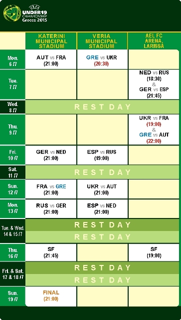 Μπορείτε να βρείτε το αναλυτικό πρόγραμμα όλων των αγώνων (και στις 3 πόλεις) αλλά και όλες τις πληροφορίες στο επίσημο site της διοργάνωσης: http://www.greece2015.gr