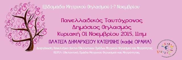 Η εκδήλωση μας θα πραγματοποιηθεί την Κυριακή 1 Νοεμβρίου 2015, στην Πλατεία Δημαρχείου Κατερίνης, στο καφέ «Οραμα». Ώρα προσέλευσης η 11.00 π.μ. Καθώς ο θηλασμός είναι ελεύθερος και δεν υπακούει σε ωράρια, τα μωράκια που θα θέλουν να θηλάσουν γύρω στις 12.00 θα καταμετρηθούν στον Πανελλαδικό Ταυτόχρονο Δημόσιο Θηλασμό!