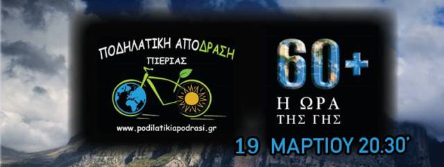 Η Ποδηλατική Από-Δραση Πιερίας για άλλη μία χρονιά συμμετέχει στην παγκόσμια αυτή δράση (EARTH HOUR), διοργανώνοντας μια βόλτα με τα ποδήλατά μας, στις γειτονιές της Κατερίνης. Καλούμε τους φίλους του ποδηλάτου να σβήσουν τα φώτα και να ποδηλατίσουν μαζί μας για μία ώρα 20.30’-21.30’.