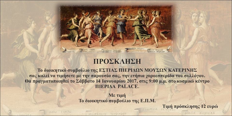 Η χοροεσπερίδα θα πραγματοποιηθεί το Σάββατο 14 Ιανουαρίου 2017 στις 9:00 μ.μ. στο κοσμικό κέντρο ΠΙΕΡΙΔΑ ΠΑΛΛΑΣ (κόμβος Νέου-Παλαιού Κεραμιδίου Κατερίνης).