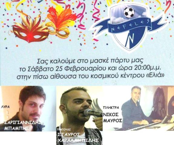 Ντυνόμαστε μασκαράδες Το Σαββατόβραδο 25 Φεβρουαρίου, μικροί και μεγάλοι και συμμετέχουμε στο Αποκριάτικο Πάρτυ της Γυναικείας Ποδοσφαιρικής Ομάδας “ΝΕΦΕΛΕΣ” στην Αίθουσα του Κοσμικού Κέντρου Ελιά στην Κατερίνη. Στην πίσω αίθουσα.