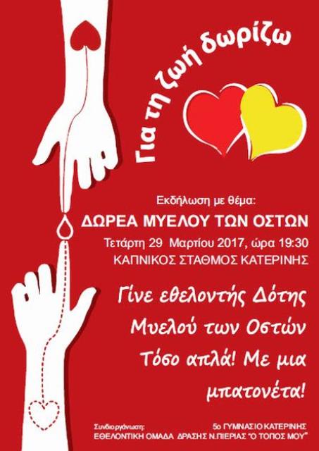 Ο Σύλλογος Γονέων, καθηγητών και μαθητών του 5ου Γυμνασίου Κατερίνης και το Κοινωνικό Ιατρείο Κατερίνης «Αλέκος Φτίκας» της Εθελοντικής Ομάδας Δράσης Ν.Πιερίας και των Γιατρών του Κόσμου, σας προσκαλούν να συμμετάσχετε στην εκδήλωση με θέμα «Δωρεά Μυελού των Οστών» που θα πρεγματοποιηθεί την Τετάρτη 29 Μαρτίου στις 7.30 μ.μ. στον Καπνικό Σταθμό Κατερίνης, στην οδό Φλέμιγκ 8, δίπλα στο πάρκινκ των Νέων Δικαστηρίων,