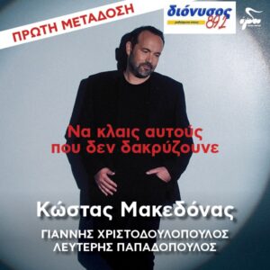 «Να κλαις αυτούς που δε δακρύζουνε» από τον Κώστα Μακεδόνα Μουσική: Γιάννης Χριστοδουλόπουλος Στίχοι: Λευτέρης Παπαδόπουλος Ο Κώστας Μακεδόνας μας παρουσιάζει το νέο τραγούδι με τίτλο «Να κλαις αυτούς που δε δακρύζουνε» σε μουσική του Γιάννη Χριστοδουλόπουλου και στίχους του κορυφαίου μας στιχουργού Λευτέρη Παπαδόπουλου! Μία απόλυτα ερωτική μπαλάντα με στίχους που χτυπούν απευθείας στην καρδιά, μελοποιημένους …