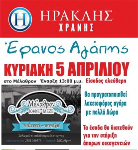 Η ποδοσφαιρική ομάδα “ΗΡΑΚΛΗΣ ΧΡΑΝΗΣ” πραγματοποιεί Έρανο Αγάπης -Λαχειοφόρο Αγορά με σκοπό την ενίσχυση αδύναμων οικογενειών του Νομού μας. Λαχνούς, προς 1 ευρώ τον καθένα, μπορείτε να προμηθευτείτε από ποδοσφαιριστές της ομάδας οι οποίοι θα διανέμουν λαχεία σε διάφορα μέρη του Νομού καθώς και την ημέρα της κλήρωσης, Κυριακή 05-04-2015, στον χώρο που θα πραγματοποιηθεί …
